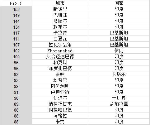 今天,WHO发布的世界上PM2.5年平均数值最高的20个城市排名,排名显示,印度首都新德里的PM2.5年平均数值最高,为153,值得一提的是,“前20名”印度就占了13名。在数据库中排名最高的中国城市是兰州,名列第36位,年均PM2.5浓度为71。而众所关注的北京年平均PM2.5浓度为56,排在第76位。